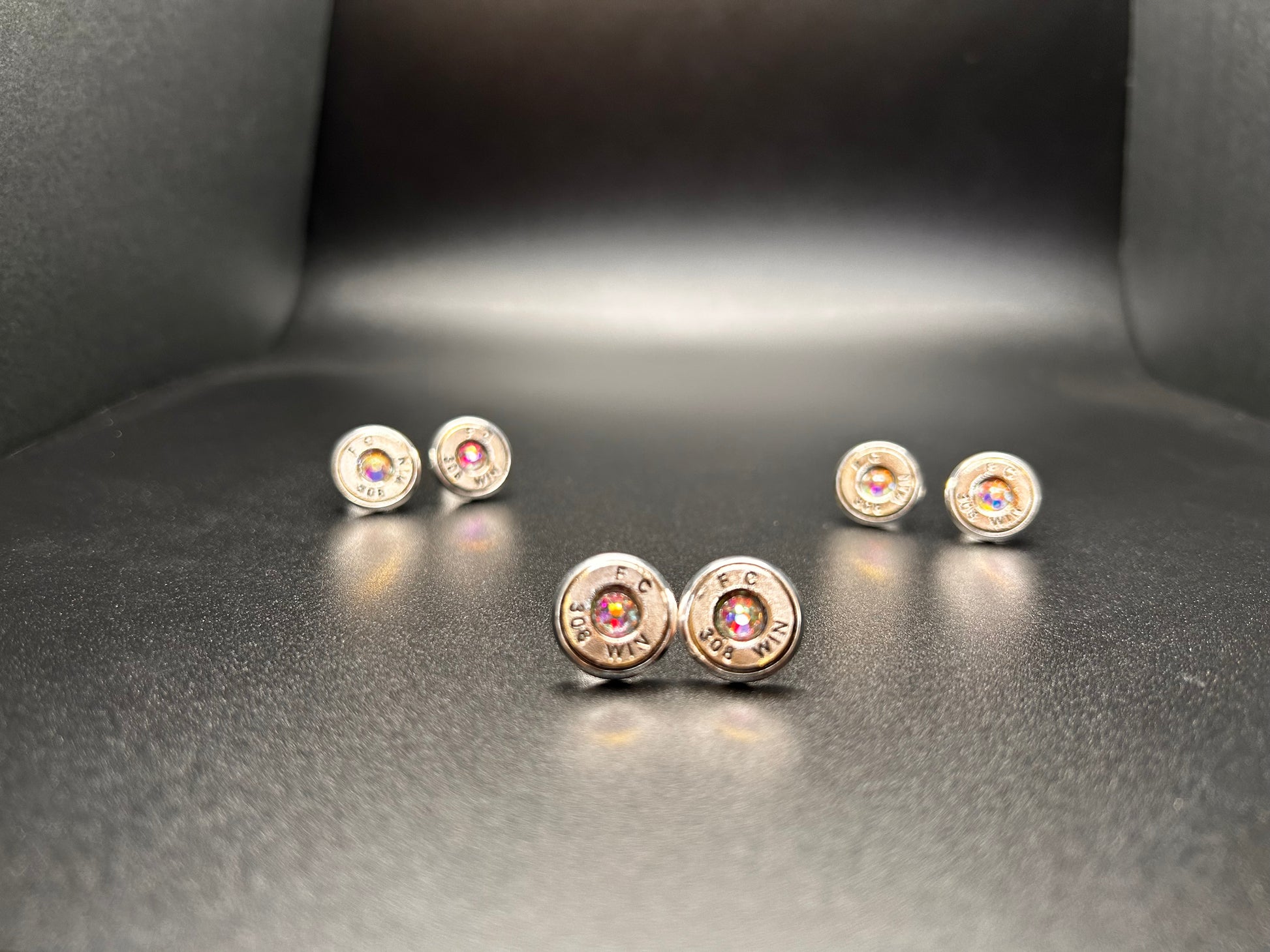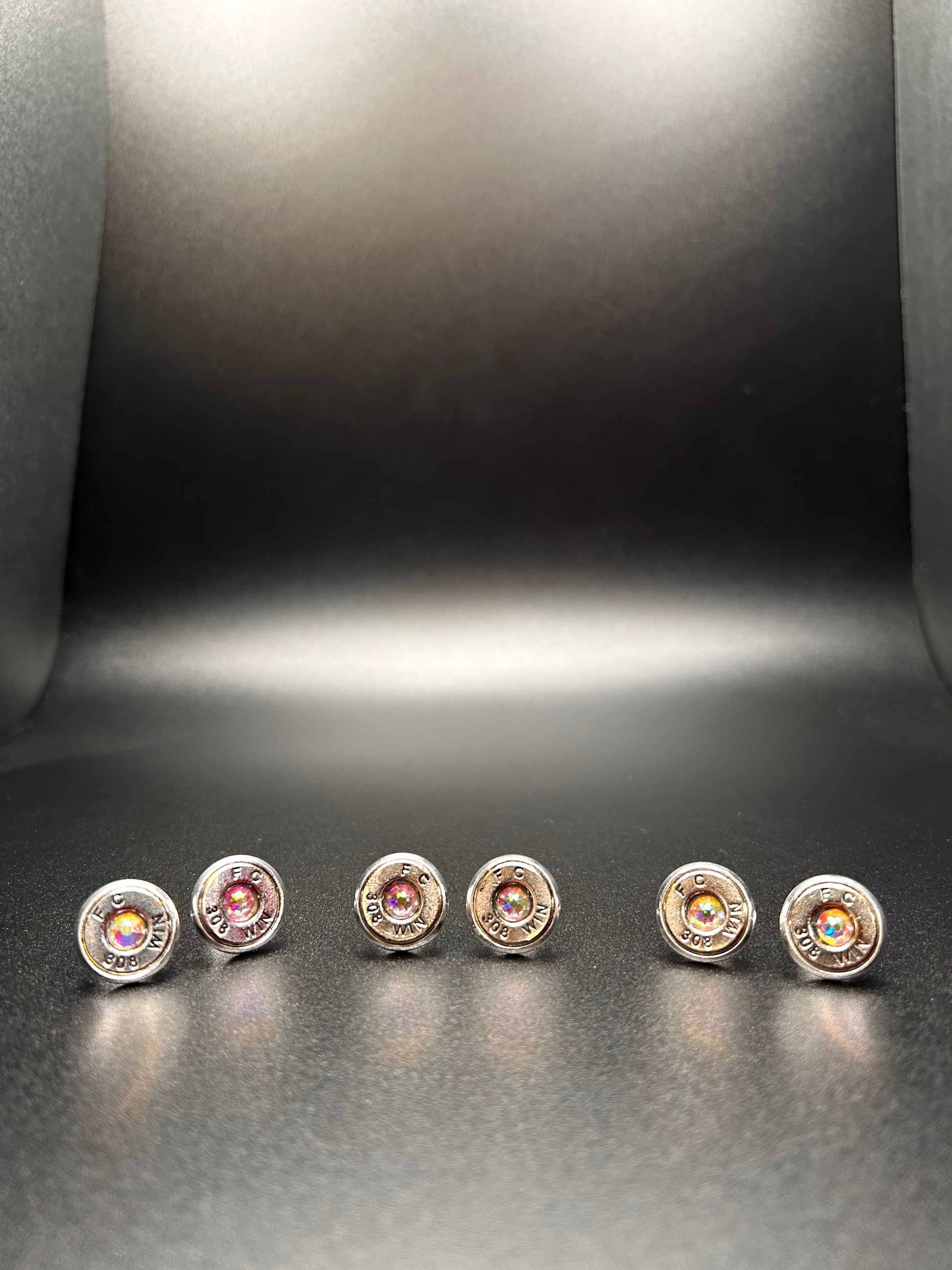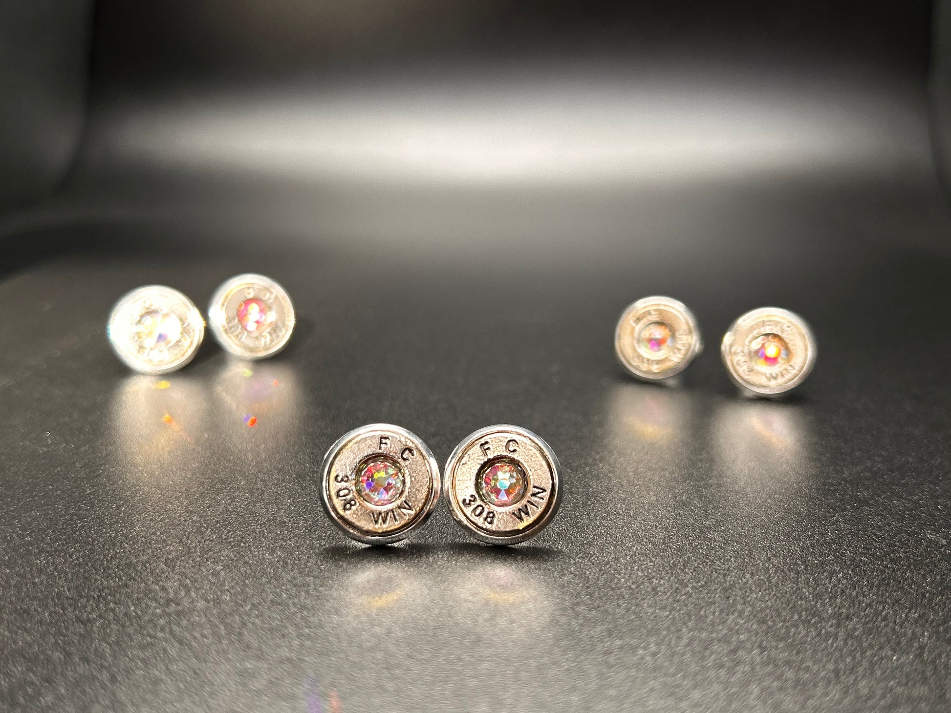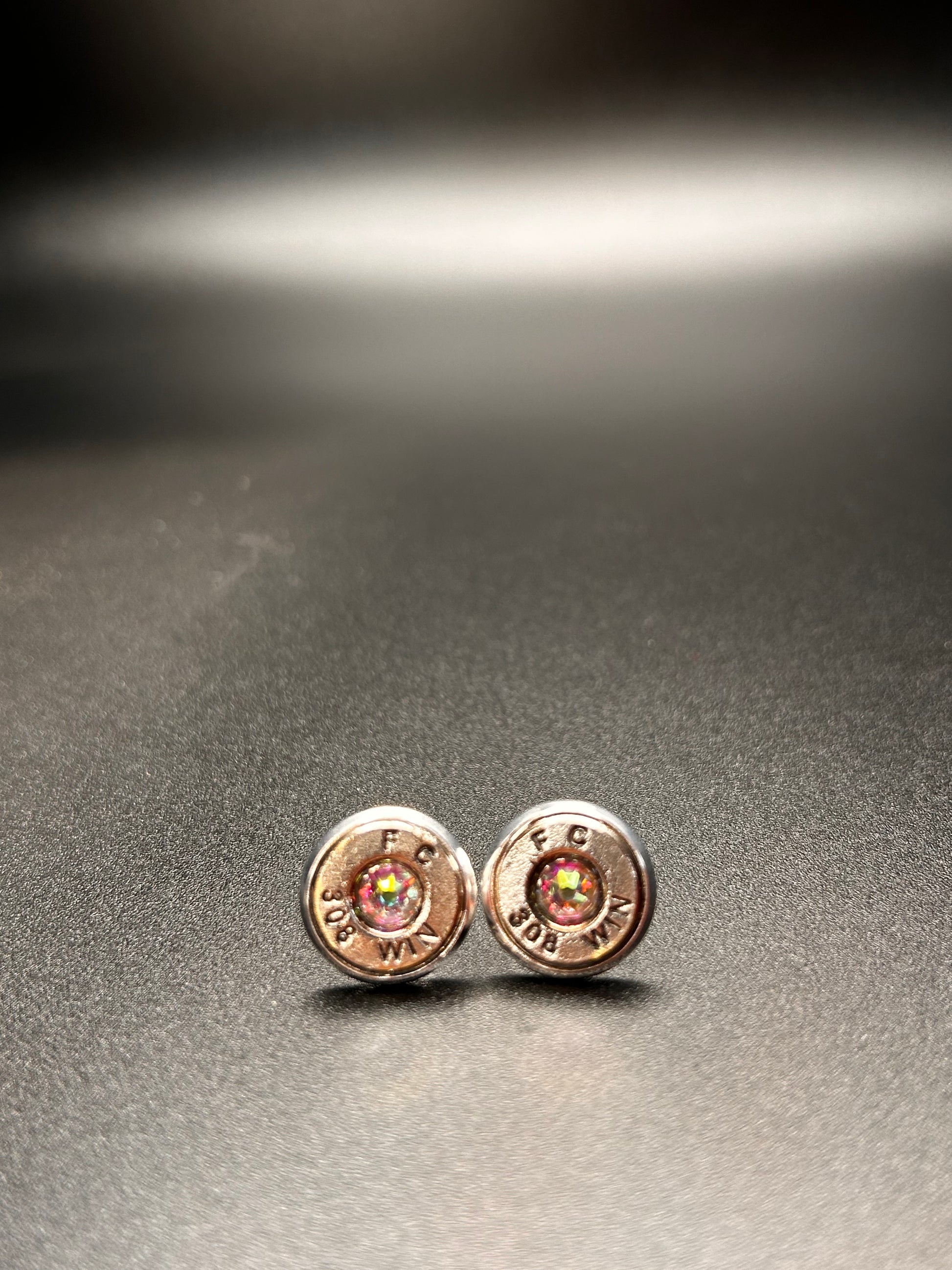 These earrings were made with Winchester 308 rounds and Aurora Borealis Swarovski crystals. The bezel post is silver-plated stainless steel.