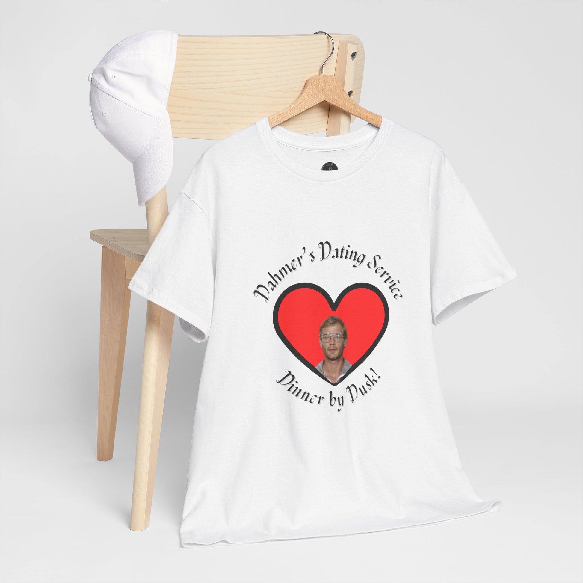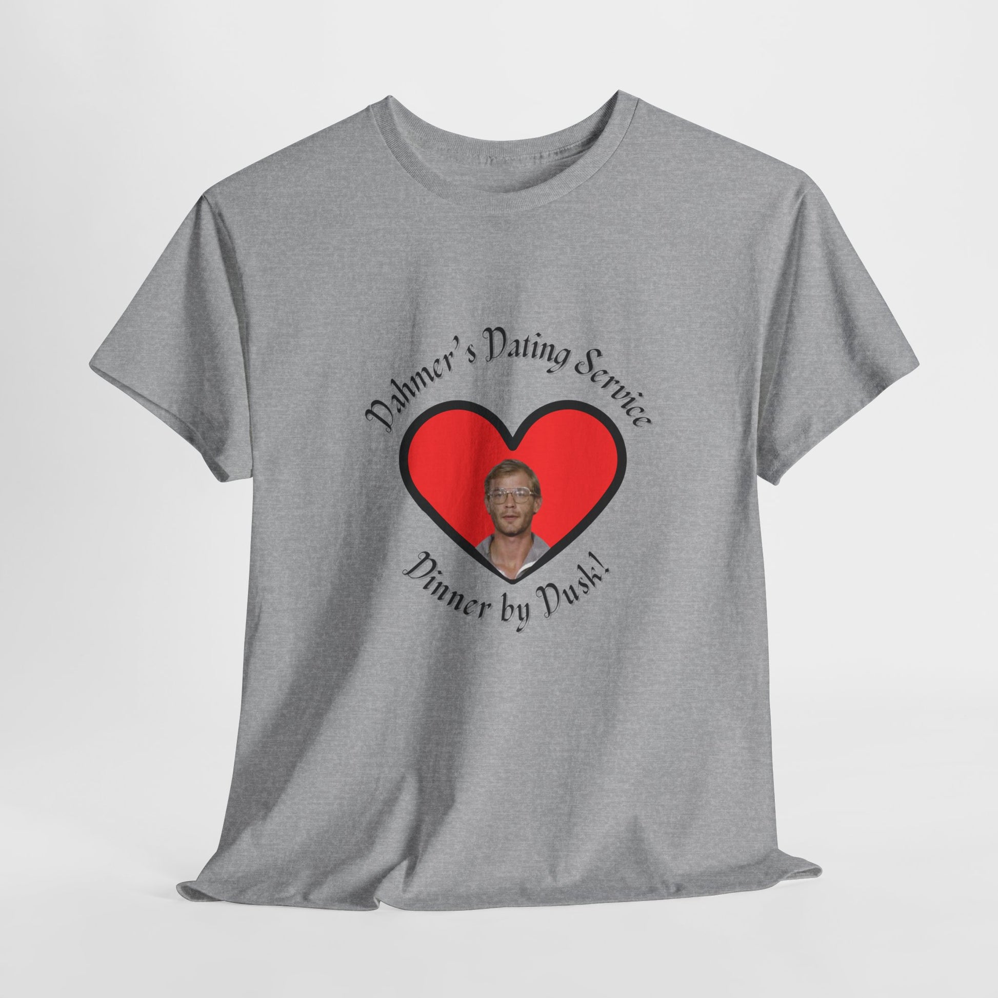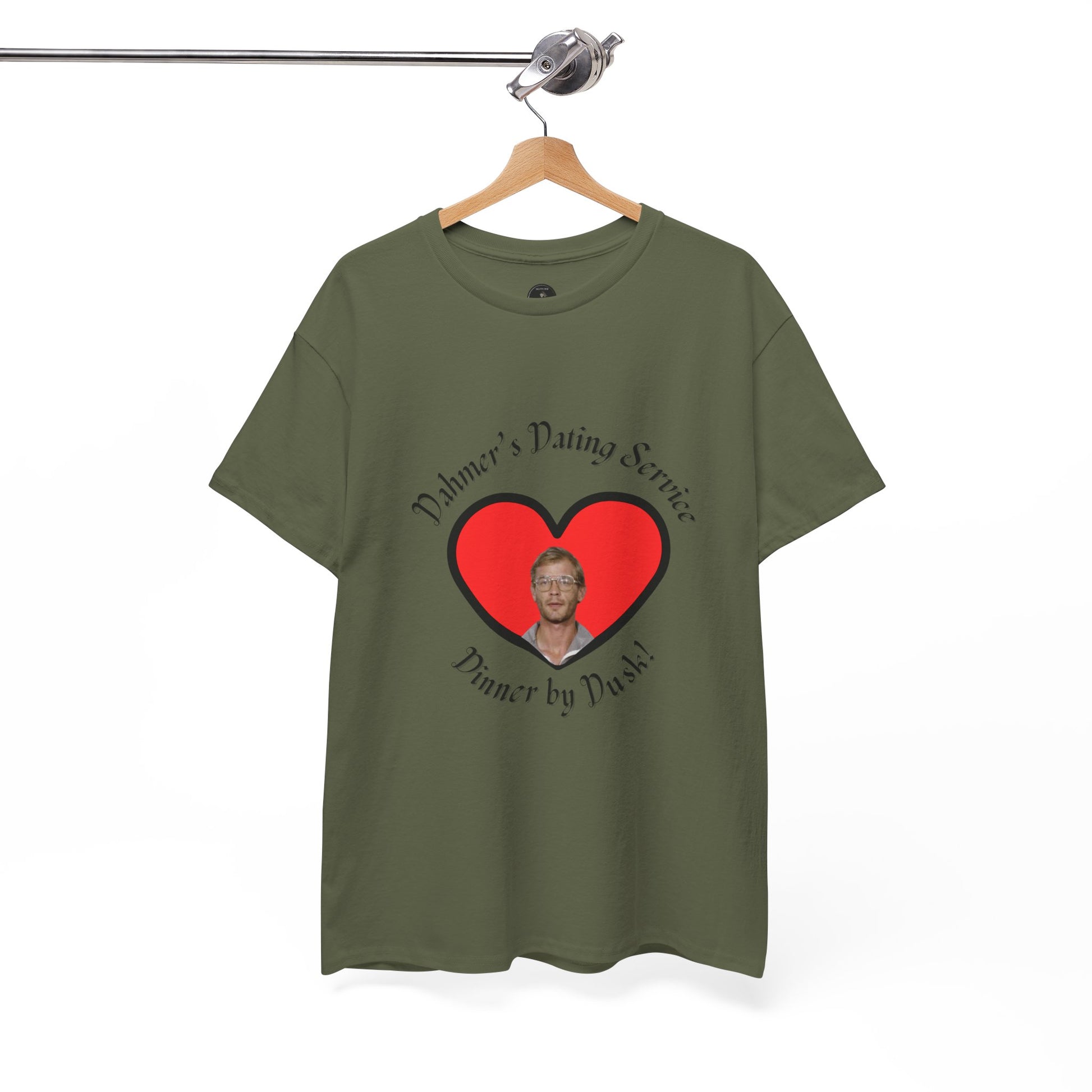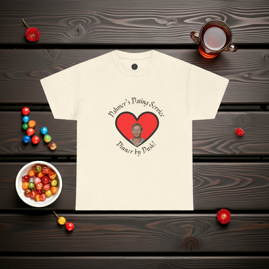 Embrace your dark humor with this funny Dahmer's Dating Service t-shirt. It's simple yet attention grabbing design will break the ice at any occasion. Available in four colors. Made with eco-friendly fabric made from ethically sourced US cotton.