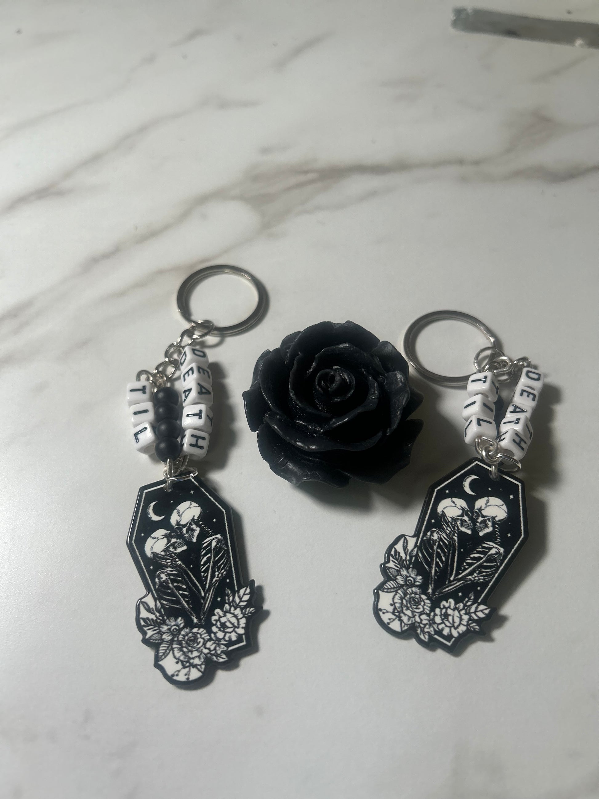 This lovely "The Lover's" charm keychain is accented with acrylic beads, to emphasize the eternalness of the skeleton kindred spirits.