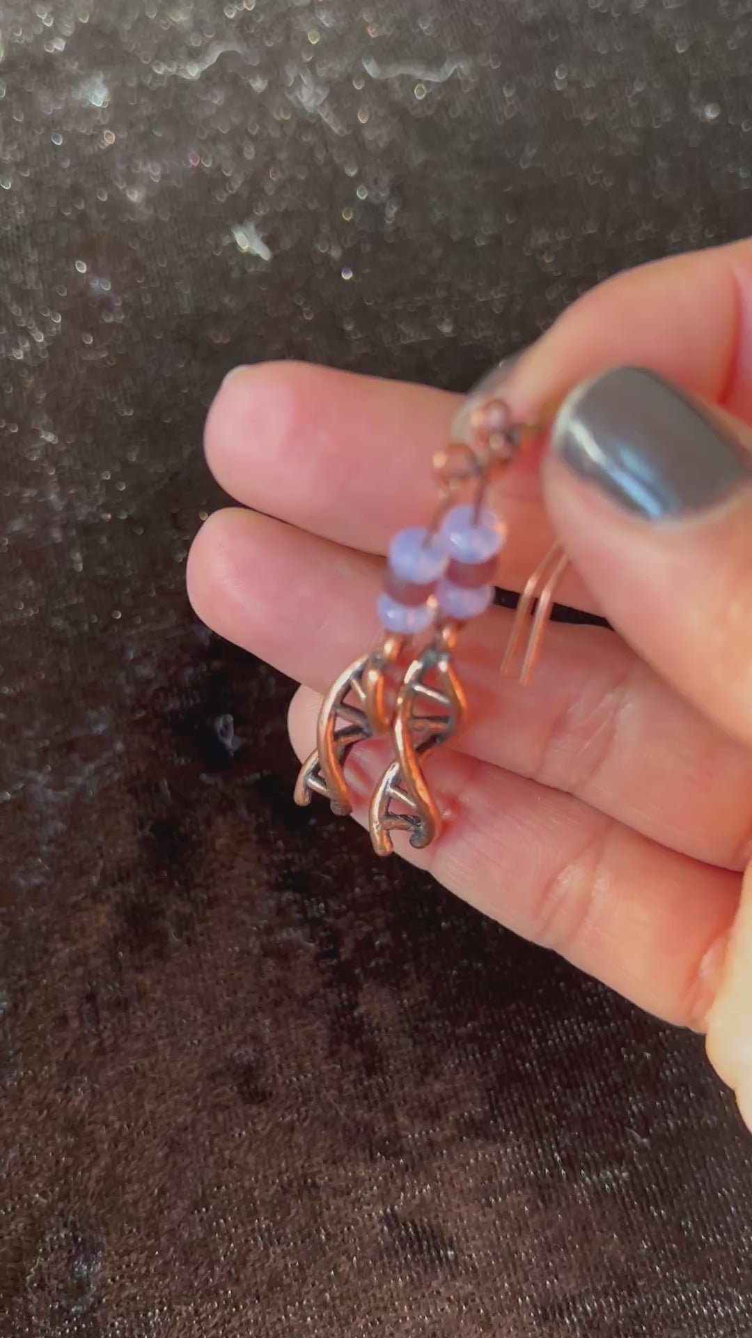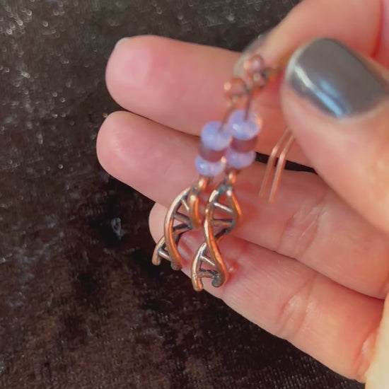 These handmade copper-plated wired earrings bring a fun and unique spin that will catch anyone's attention. Czech glass beads accent the DNA charm perfectly and provide a simplistic yet unique appeal