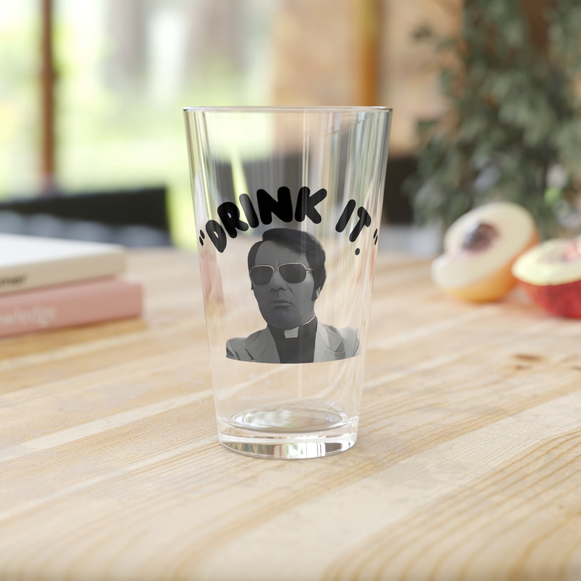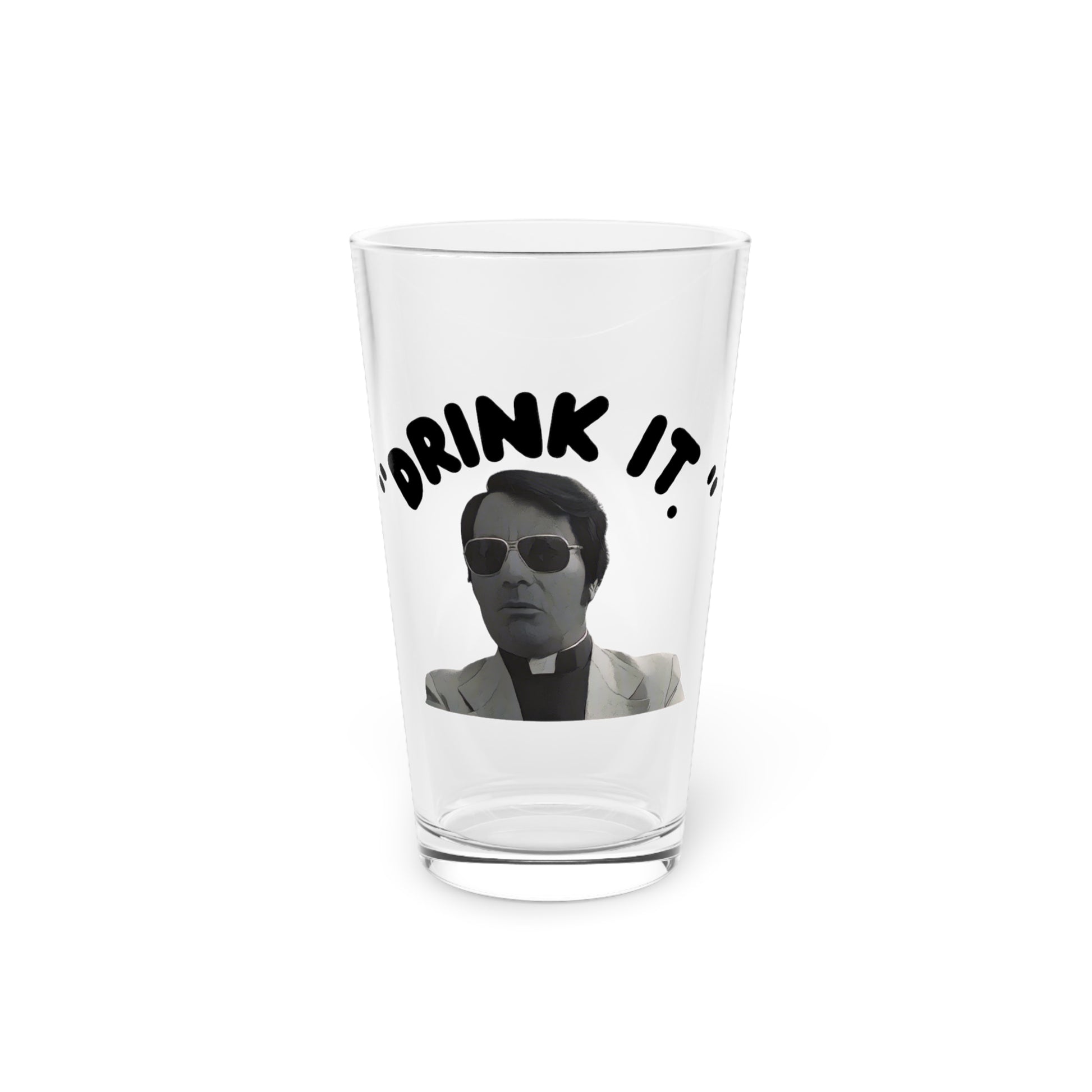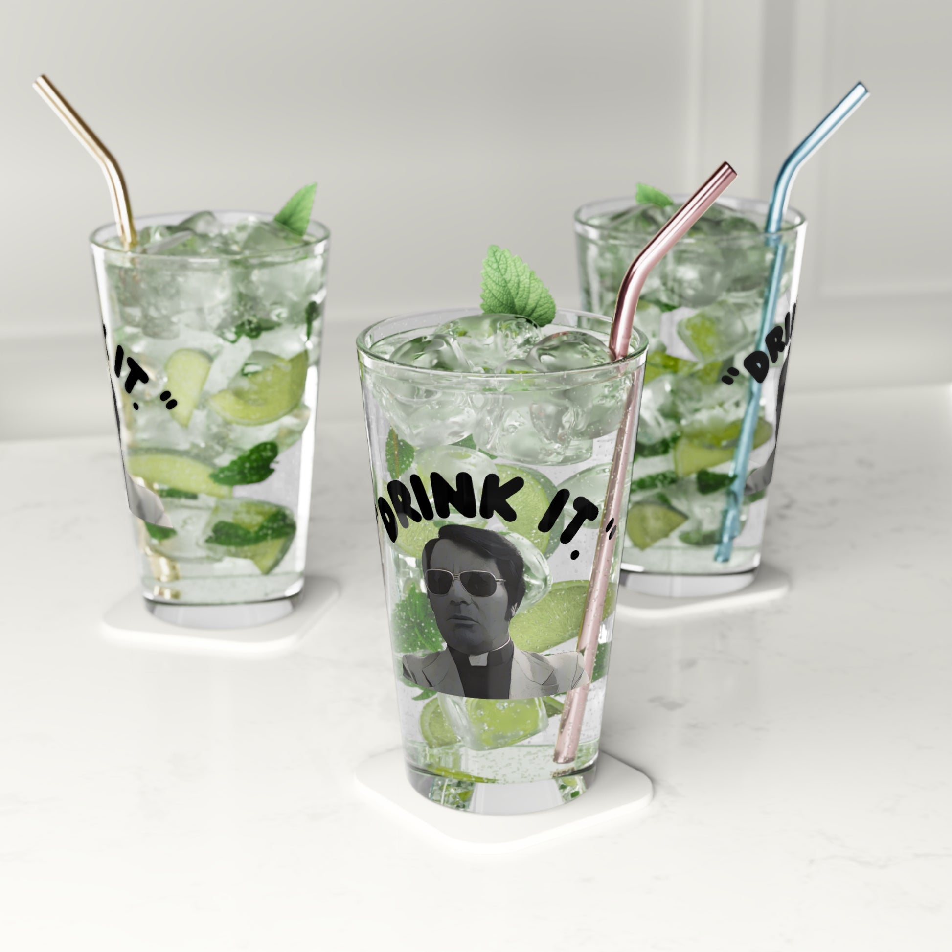 Enjoy a nice cold one with our Jim Jones pint glass. Instead of being pressured to drink cyanide Flavor-Aid, enjoy a refreshing cocktail or beer.