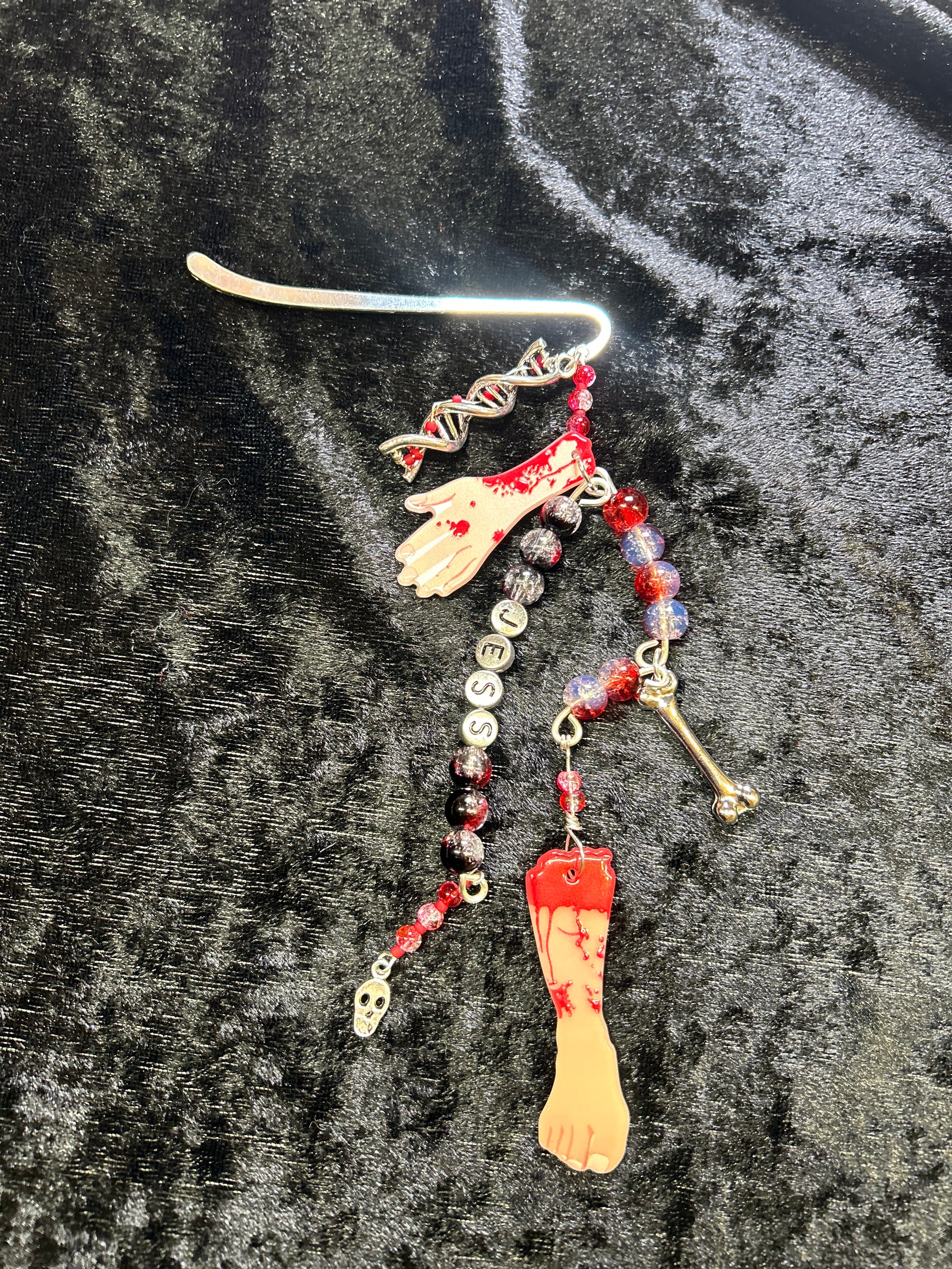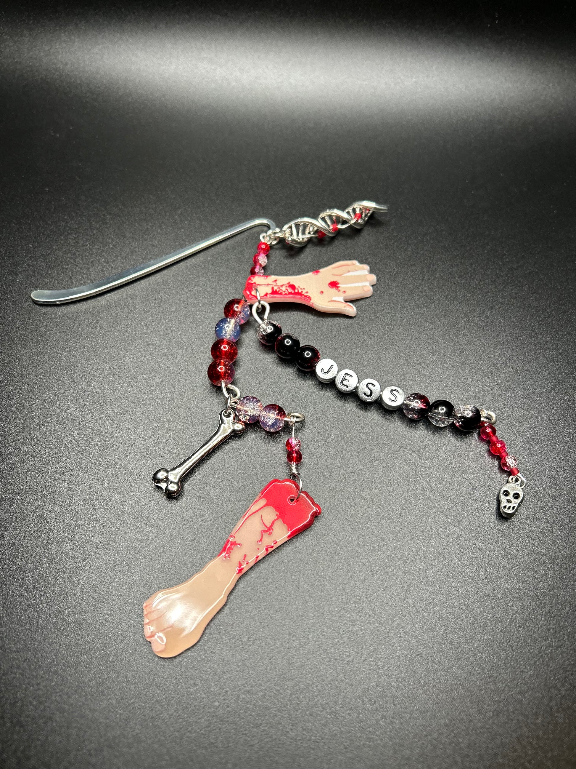 This gory bloody hand book charm is the perfect gift for the spooky person or true crime addict in your life. The bloody micro-bead accents against a silver-plated DNA charm. A beautiful yet creepy customizable gift!