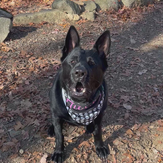 Check out our personalized Punk Style Bandana decorated with skulls. Perfect for pets with an edgy style. Ideal for pet owners who want to add a rock and roll vibe to their furry friend's look. Just because it isn't Halloween, doesn't mean your dog can't rock skulls all year round!
